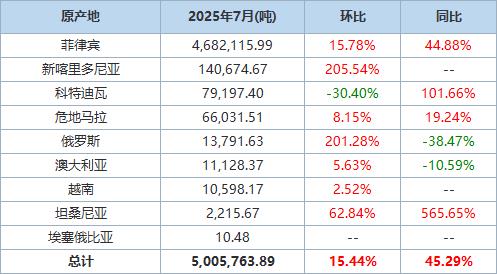 以下为根据中国海关总署官网数据整理的2025年7月镍矿砂及其精矿进口分项数据一览表: