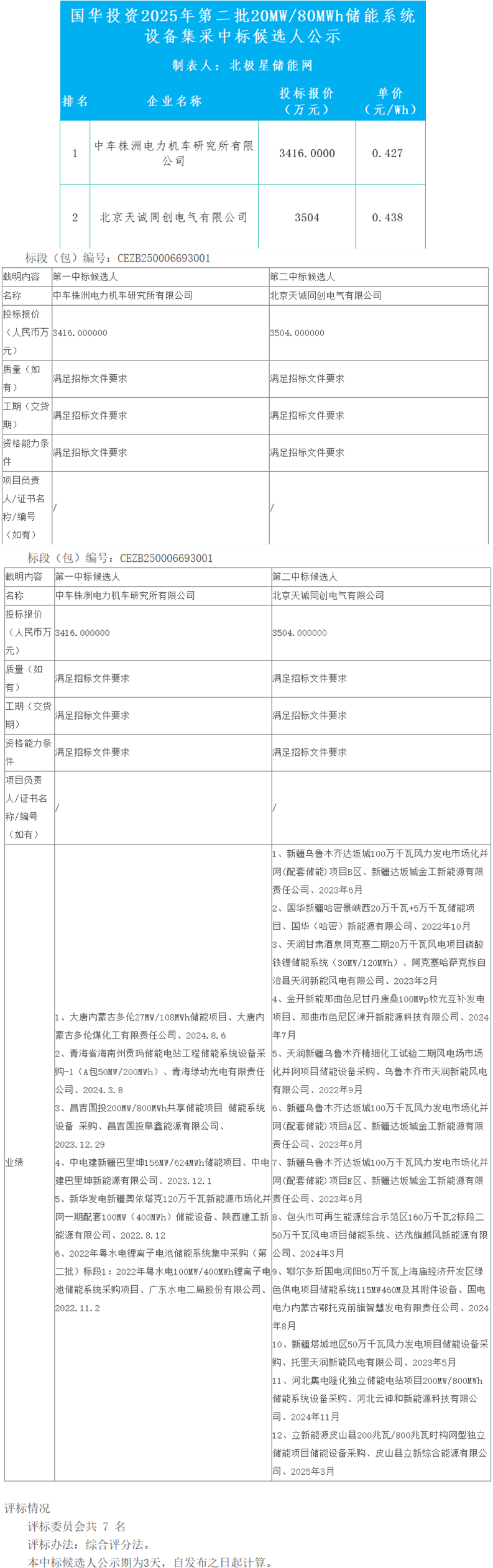 第二中标候选人为北京天诚同创电气有限公司,投标报价3504万元,折合单价0.438元/Wh。