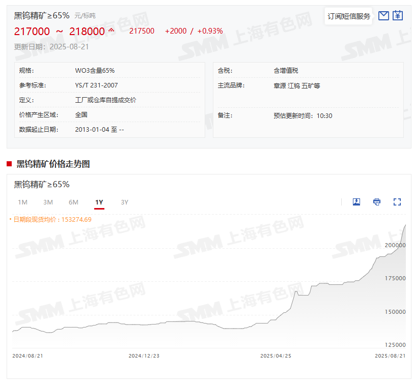 8月21日,黑钨精矿(≥65%)延续了前8个交易日的涨势继续上行,其价格为217000~218000元/标吨,均价报217500元/标吨,较其前一交易日上涨0.93%。黑钨精矿(≥65%)8月21日217500元/标吨的均价与2024年12月31日的均价142750元/标吨相比,其均价今年以来上涨了74750元/标吨,涨幅为52.36%。