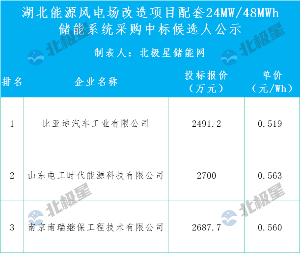 第一中标候选人为比亚迪汽车工业有限公司,投标报价2491.2万元,折合单价0.519元/Wh;
