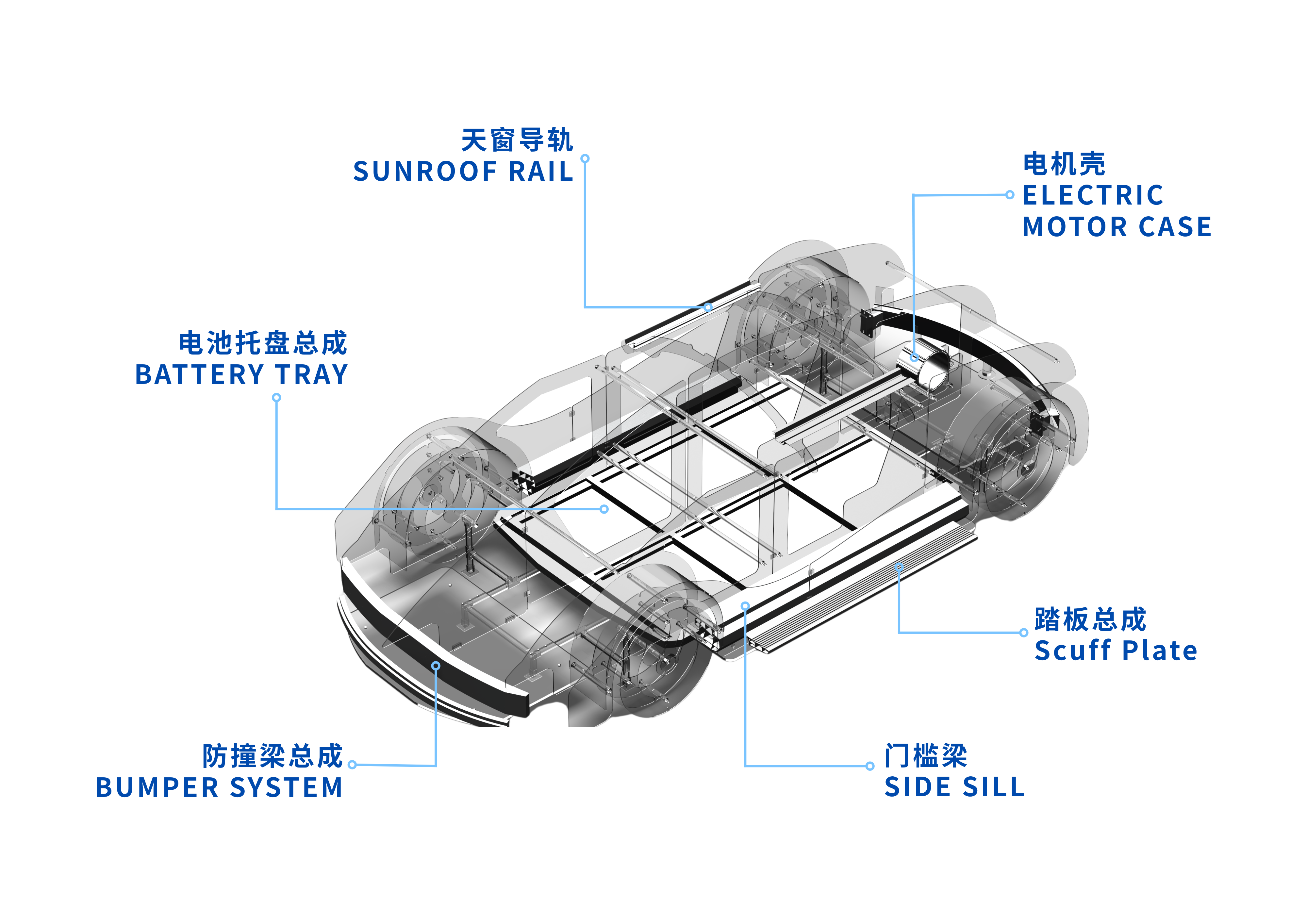 齐力澳美产业链涵括合金研发、模具设计与开发、铝棒熔铸、型材挤压、表面处理以及精深加工等模块,可开发1、5、6、7系列合金材料,生产各类异型大断面型材,满足汽车轻量化、海工船舶、3C电子等多个行业领域的产品应用需求。