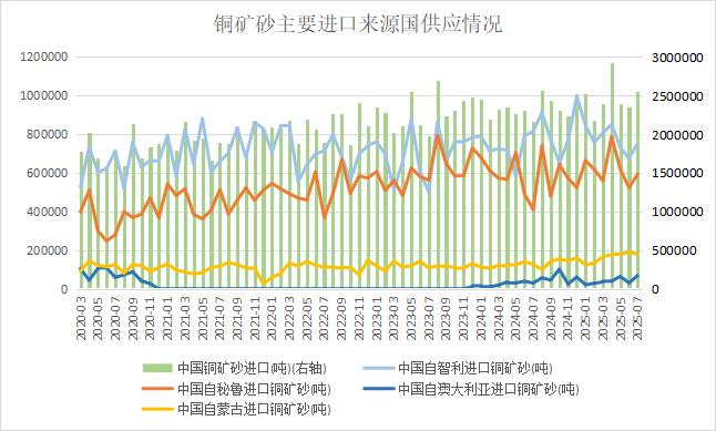 以下为2020年3月以来中国铜矿砂主要进口来源国供应情况: