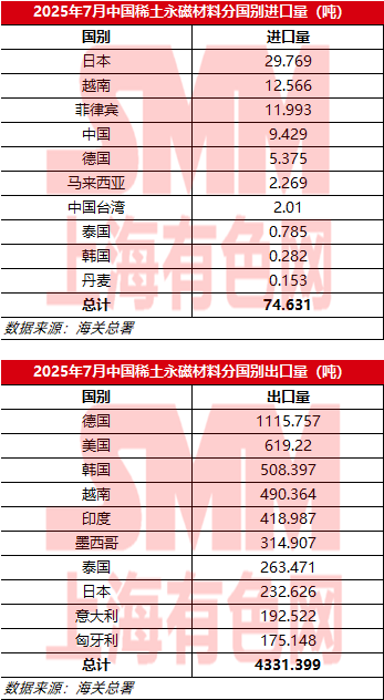 2025年7月中国稀土永磁材料分国别进出口量
