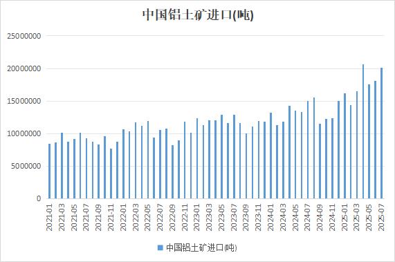 海关总署在线查询数据显示,中国2025年7月铝土矿(铝矿砂及其精矿)进口量为2006万吨,环比增长10.7%,同比上涨33.7%。其中几内亚仍是最大供应国,当月输送量在1594万吨,环比增近两成,同比大增逾七成,受前期矿山抢发货影响,几内亚本月输送量有明显提升。