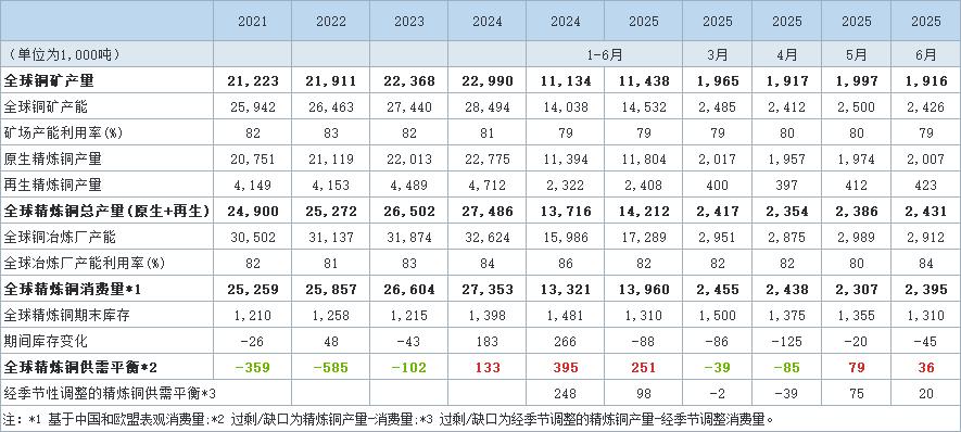 6月份全球精炼铜产量为243万吨,消费量为240万吨。