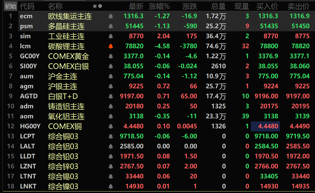 此外,铸造铝主连期货涨0.25%,氧化铝主连跌0.35%。碳酸锂主连跌4.58%,工业硅主连延续前一个交易日的涨势继续涨2.04%。多晶硅主连跌1.13%。
