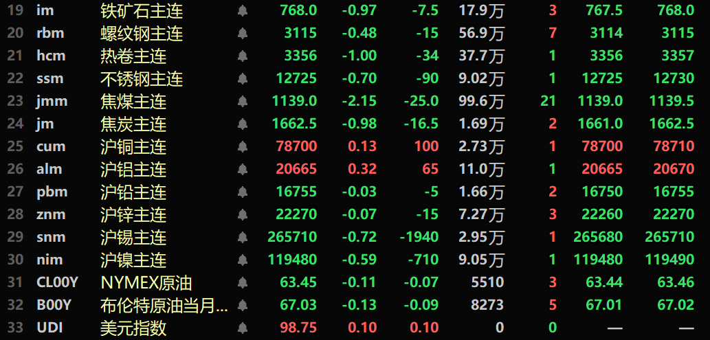 黑色系均飘绿,铁矿跌0.97%,螺纹跌0.48%,热卷跌1%。不锈钢跌0.7%。双焦方面:焦煤主力合约跌2.15%,焦炭主力合约跌0.98%。