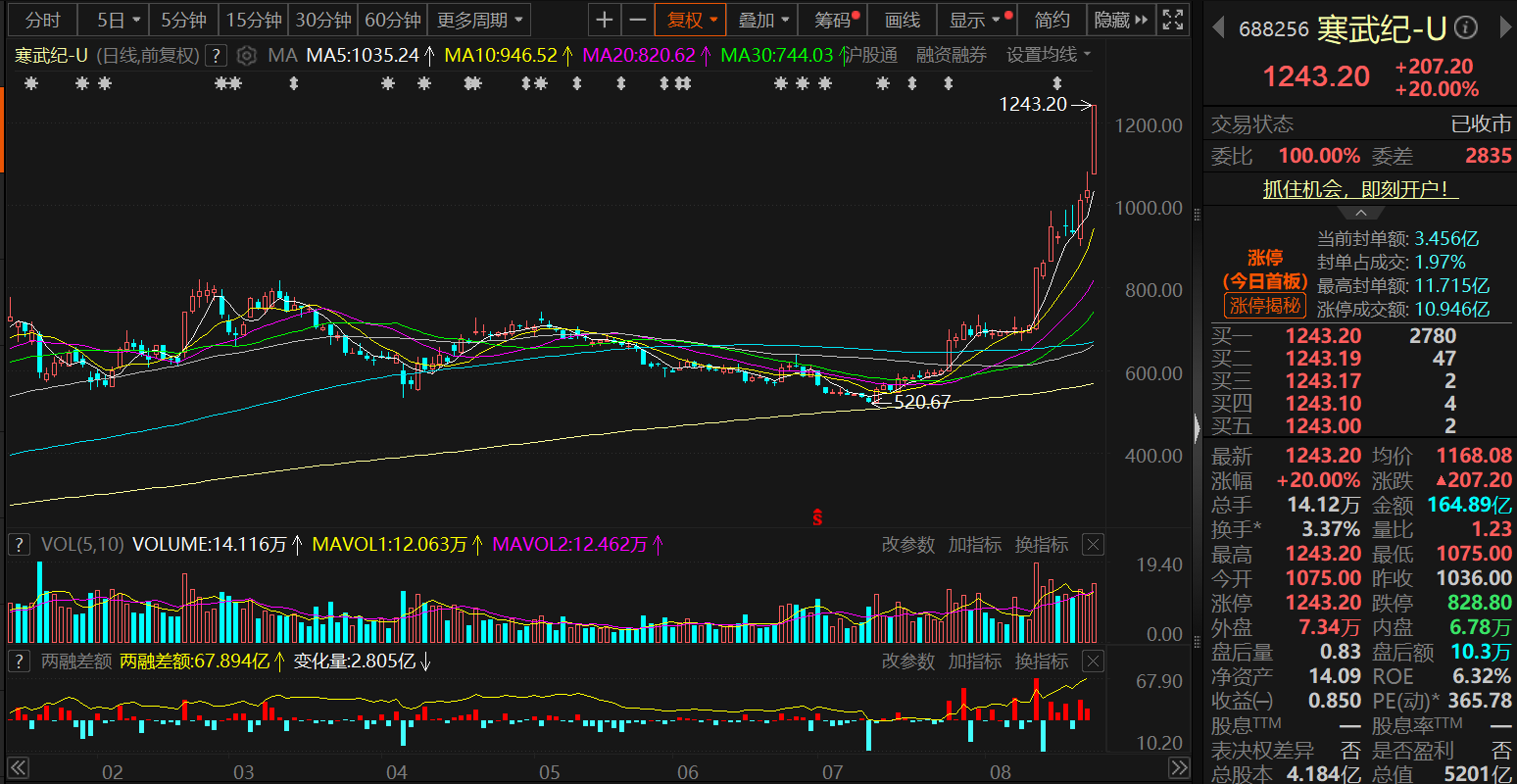 个股方面,寒武纪-U自8月12日以来其股价接连攀升,并于8月20日成功冲破1000元/股的整数关口,接连刷新其历史新高。8月22日,在大盘表现抢眼,半导体板块飙涨的情况下,寒武纪-U再度不负众望,盘中一度涨20%封死涨停板,报1243.2元/股,续刷其上市以来的历史新高。而截至目前,寒武纪U也成为了A股除了贵州茅台以外股价最高的股票,是继茅台之后唯一突破千元大关的个股。