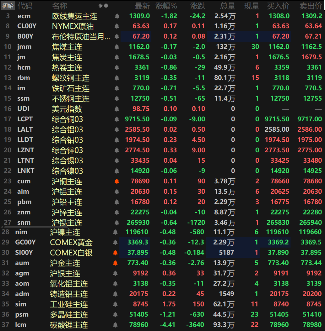 此外,碳酸锂主连跌4.41%,多晶硅主连跌1.21%,工业硅主连涨1.75%。欧线集运主连跌1.82%报1309。