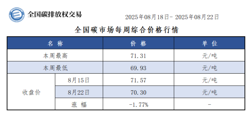 本周全国碳市场综合价格行情为:最高价71.31元/吨,最低价69.93元/吨,收盘价较上周五下跌1.77%。