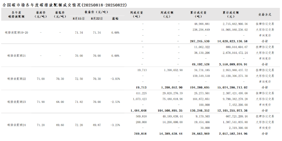 2025年1月1日至8月22日,全国碳市场碳排放配额成交量59,360,410吨,成交额4,383,310,141.32元。