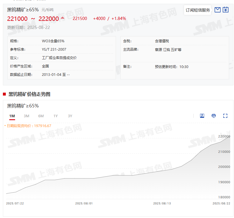 8月22日,黑钨精矿(≥65%)延续了前9个交易日的涨势继续上行,其价格为221000~222000元/标吨,均价报221500元/标吨,较其前一交易日上涨1.84%。黑钨精矿(≥65%)8月22日221500元/标吨的均价与2024年12月31日的均价142750元/标吨相比,其均价今年以来上涨了78750元/标吨,今年以来的涨幅为55.17%。