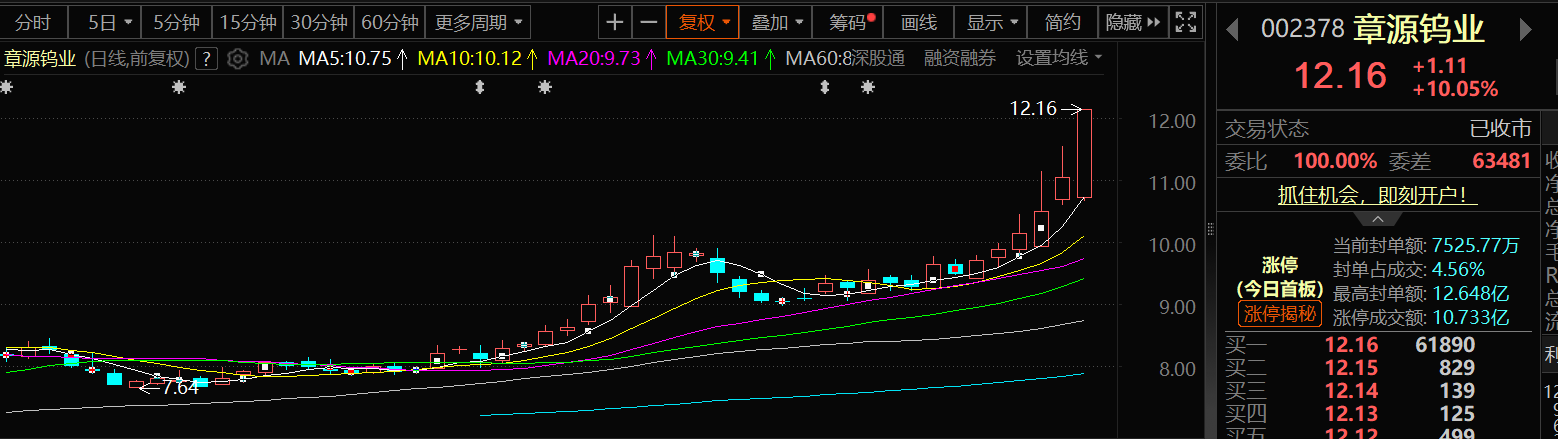 章源钨业近来股价持续上涨,截至8月22日,更是迎来了6连涨,值得一提的是,章源钨业8月22日的股价出现了涨停,截至22日收盘,章源钨业涨10.05%,报12.16元/股。