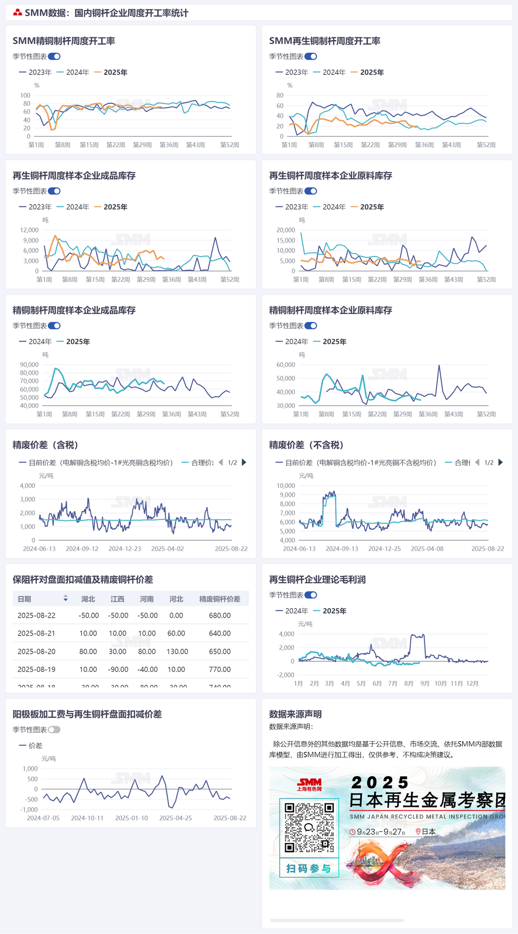 据SMM的调查数据显示,本周再生铜杆的开工率为16.83%,较上周下降了2.52个百分点,同比下降了2.74个百分点。同时,精废铜杆的平均价差本周为每吨724元,环比缩小39元。此外,江西再生铜杆的价格对期货盘面扣减均值26元/吨,环比缩小110元/吨。根据SMM对再生铜杆销售毛利润模型测算所得,周内毛利润为-290元/吨,环比缩小52元/吨。