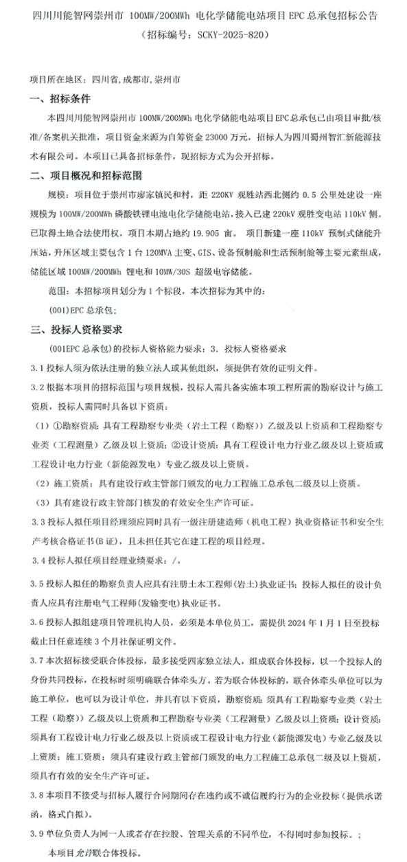 北极星储能网讯:8月21日,四川川能智网崇州市100MW/200MWh储能电站项目EPC发布招标公告,项目自筹资金23000万元,约合1.15元/Wh,招标人为四川蜀州智汇新能源技术有限公司。
