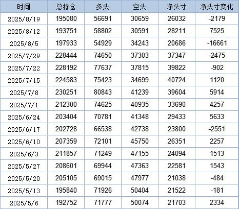 美国商品期货交易委员会(CFTC)公布的报告显示,截至8月19日当周,基金持有的COMEX铜期货净多仓下滑至26032手。