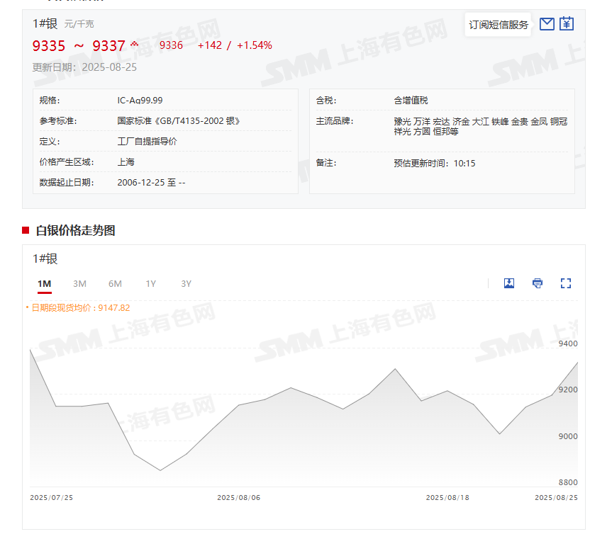 8月25日,SMM1# 白银上午出厂参考均价为9336元/千克,均价较前一交易日上涨142元/千克,涨幅为1.54%。日内沪期银2510合约-TD基差扩大至30元/千克以上,持货商对TD升水较上周五暂未调整。据SMM了解,上海地区现款现货的国标银锭仓单对TD升水3-5元/千克报价成交,大厂银锭对TD升水5-7元/千克刚需成交。少量上海地区国标银锭现货(非仓单)对TD平水报价,另有部分对沪期银2510合约报价的持货商贴水25元/千克报价但成交偏淡,此外,江西地区冶炼厂厂提现货对TD升水1元/千克报价成交。银价走强后,持货商出货积极性有所回暖,下游终端维持刚需采购,现货市场成交情况较上周五有所好转。