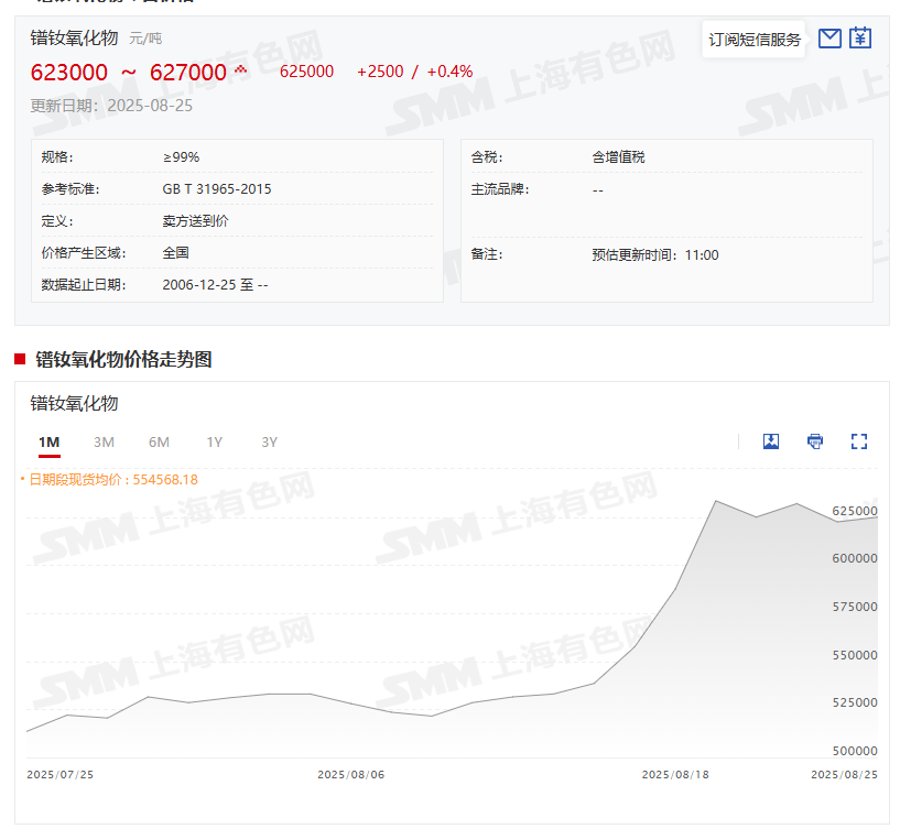 据SMM报价显示,8月25日,稀土产业链价格整体持稳运行,仅碳酸稀土、氧化镨、氧化钕以及氧化镨钕等出现小幅上涨。氧化镨钕8月25日的价格为62.3-62.7万元/吨,其均价报62.5万元/吨,较前一交易日上涨2500元/吨,涨幅为0.4%,而625000元/吨这一均价与其2024年12月31日的均价398000元/吨相比,氧化镨钕今年以来上涨了227000元/吨,涨幅为57.04%。