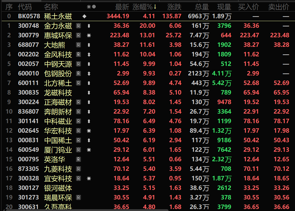 工业和信息化部、国家发展改革委、自然资源部8月22日联合发布《稀土开采和稀土冶炼分离总量调控管理暂行办法》。暂行办法指出,国家对稀土开采(含稀土矿产品等)和对通过开采、进口以及加工其他矿物所得的各类稀土矿产品(含独居石精矿)的冶炼分离实行总量调控管理。部分市场参与人士认为《暂行办法》或引发市场供应收紧的预期,进而给稀土价格提供供应端口的支撑。受市场对政策利好预期的影响,稀土永磁概念板块8月25日开盘便出现大幅走强,全天维持强势上涨态势,截至8月25日收盘,稀土永磁概念涨4.11%,个股方面:金力永磁收获20%的涨停,金风科技、中钢天源、包钢股份涨停,惠城环保、大地熊、北方稀土、龙磁科技以及正海磁材等涨幅居前。