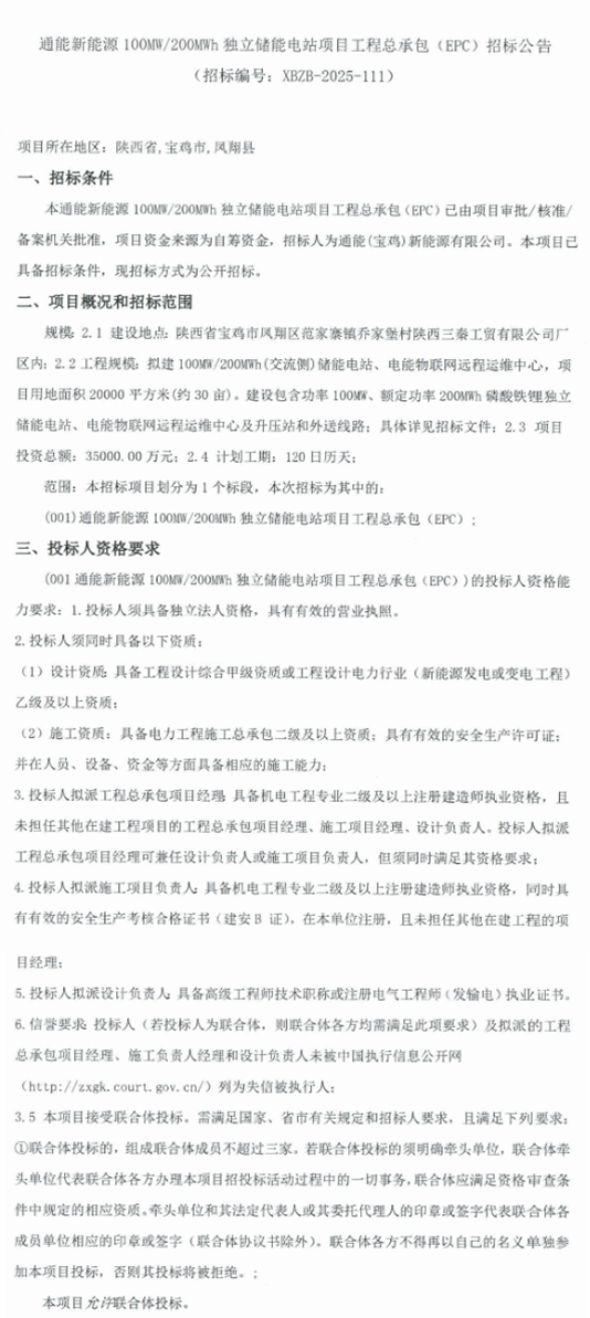 8月25日,通能新能源100MW/200MWh独立储能电站项目工程总承包(EPC)招标公告发布。项目招标人为陕西控股企业通能(宝鸡)新能源有限公司,项目位于陕西省宝鸡市凤翔县,拟建100MW/200MWh(交流侧)储能电站、电能物联网远程运维中心,项目用地面积 20000平方米(约30亩)。项目投资总额35000.00万元,折合单价1.75元/Wh计划工期120日历天。