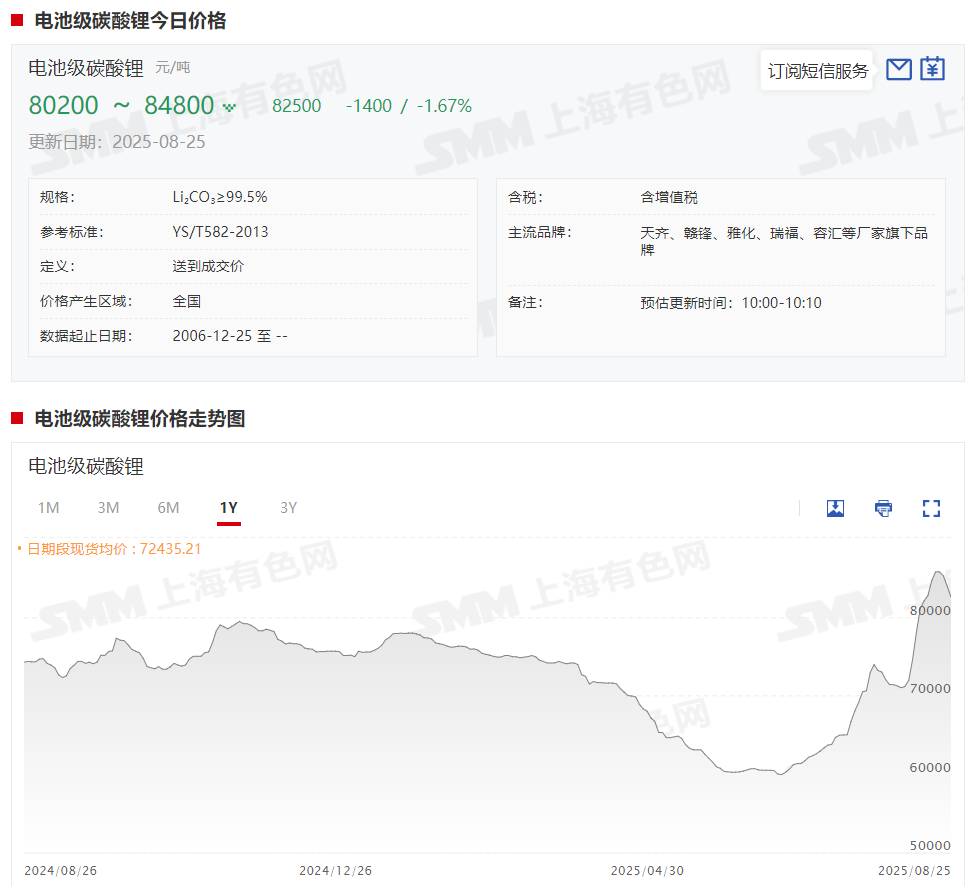 8月20日碳酸锂期货一度跌停,主要受资金面扰动影响,但基本面并未发生显著转变。价格回落带动下游采购及点价积极性回升,市场成交再度放量。整体来看,短期市场波动加剧。在下游仍存刚性采购需求、上游供应存在不确定性的背景下,碳酸锂现货价格仍获支撑,预计短期内将延续高位震荡格局。