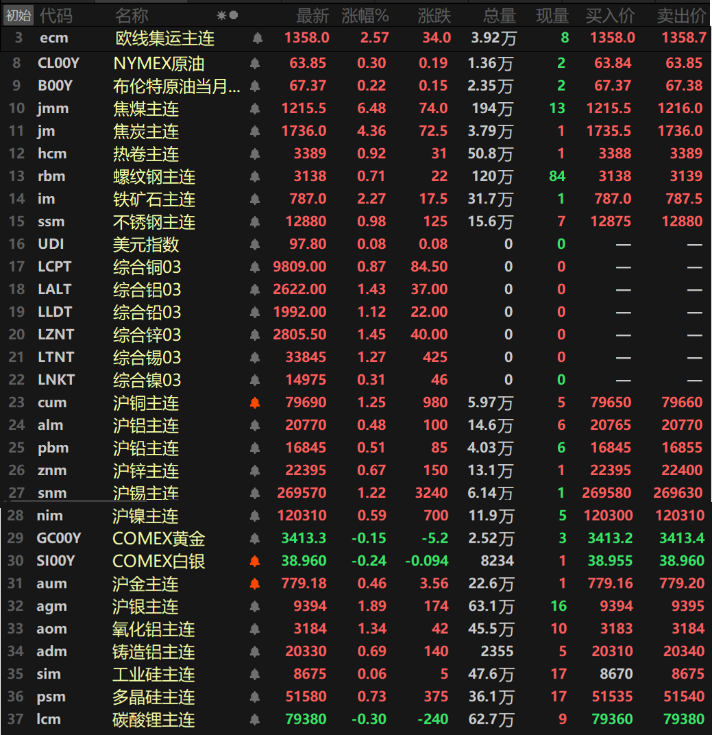 此外,碳酸锂主连跌0.3%,多晶硅主连涨0.73%,工业硅主连涨0.06%。欧线集运主连涨2.57%报1358。