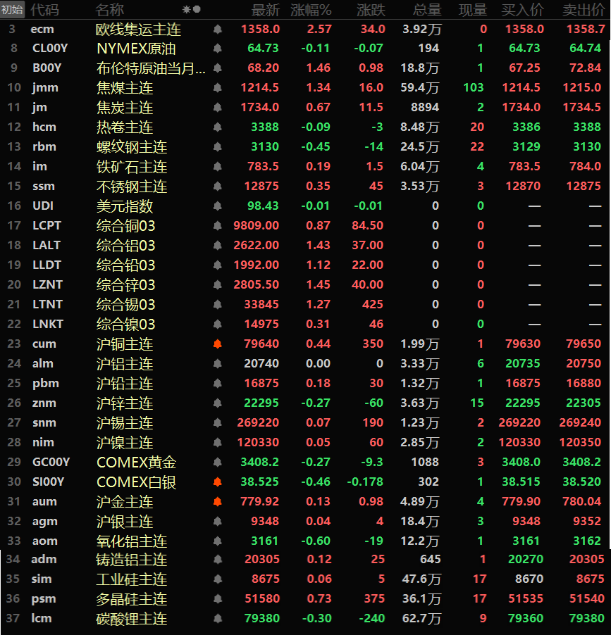 黑色系方面涨跌互现,不锈钢涨0.35%,铁矿涨0.19%。螺纹跌0.45%,双焦方面,焦煤涨1.34%,焦炭涨0.67%。
