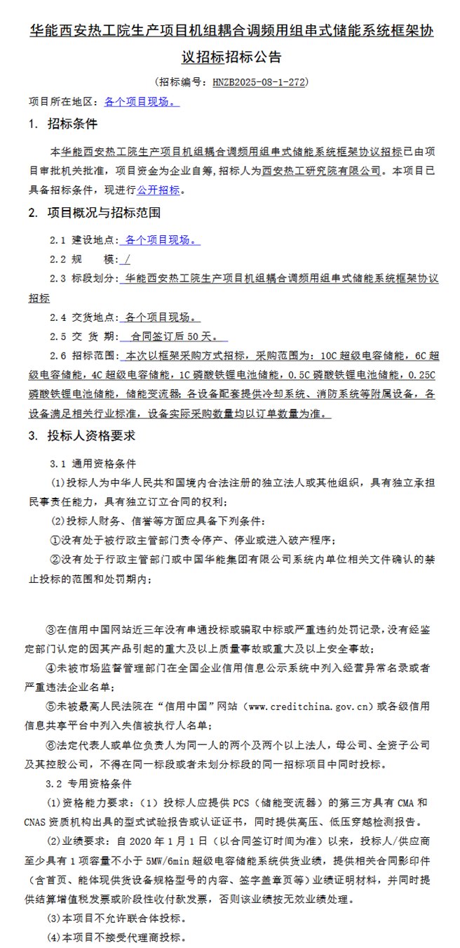 8月22日,【华能西安热工院生产项目机组耦合调频用组串式储能系统框架协议招标】招标公告发布。本次以框架采购方式招标,采购范围为:10C超级电容储能,6C超级电容储能,4C超级电容储能,1C磷酸铁锂电池储能,0.5C磷酸铁锂电池储能,0.25C磷酸铁锂电池储能,储能变流器:各设备配套提供冷却系统、消防系统等附属设备,各设备满足相关行业标准,设备实际采购数量均以订单数量为准。