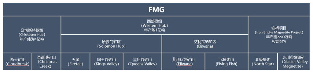 FMG全名为Fortescue Metals Group Ltd,福德士河金属集团公司。FMG由澳大利亚人安德鲁·弗里斯特(Andrew Forrest)于2003年通过收购ASX(澳大利亚证券交易所)上市公司联合矿业加工公司(Allied Mining & Processing),并将其改名而成立。FMG集团是全球铁矿业的领头企业,它拥有独特的企业文化和技术创新,在铁矿石的最佳产地西澳大利亚皮尔巴拉(Pilbara)地区开发建设了业界领先的世界一流基础设施与采矿资产。在澳大利亚仅次于力拓以及必和必拓,是澳大利亚第三大、全球第四大的铁矿石生产商。相较于力拓、必和必拓以及淡水河谷的多元化布局,FMG集中于铁矿业务。