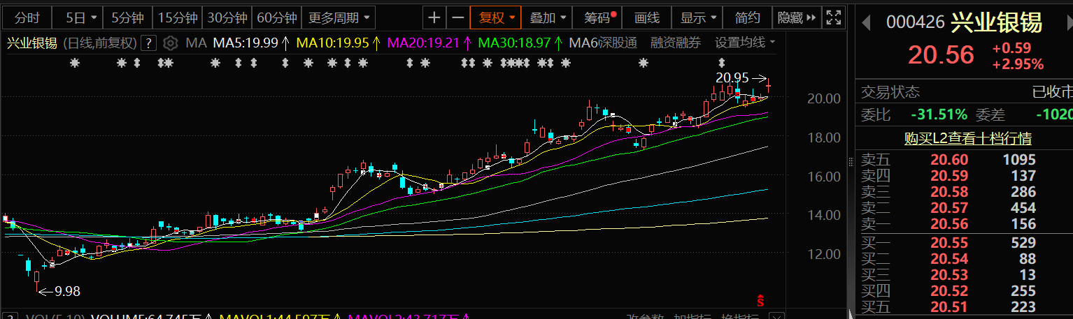 8月25日,兴业银锡股价出现上涨,截至25日收盘,兴业银锡涨2.95%,报20.56元/股。