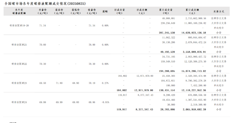 截至2025年8月25日,全国碳市场碳排放配额累计成交量689,933,793吨,累计成交额47,437,386,571.26元。