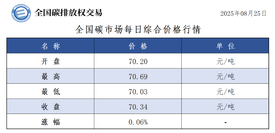 今日全国碳市场综合价格行情为: 开盘价70.20元/吨,最高价70.69元/吨,最低价70.03元/吨,收盘价70.34元/吨,收盘价较前一日上涨0.06%。