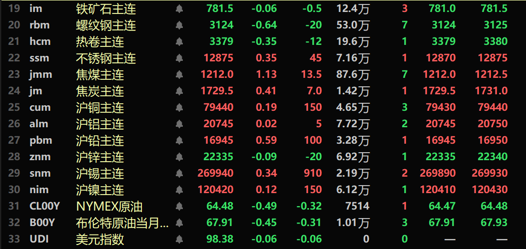 黑色系涨跌参半,铁矿微跌,螺纹跌0.64%,热卷跌0.35%。不锈钢涨0.35%。双焦方面:焦煤主力合约涨1.13%,焦炭主力合约涨0.41%。