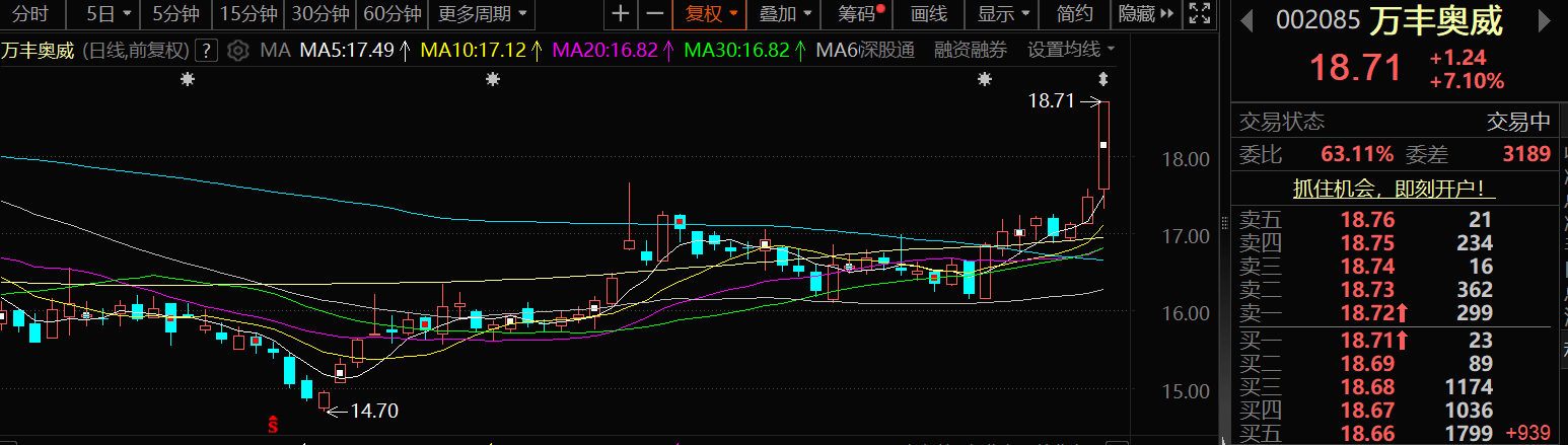 8月26日,万丰奥威股价延续前两个交易日的涨势继续出现上涨,截至26日14:01分,万丰奥威涨7.1%,报18.71元/股。