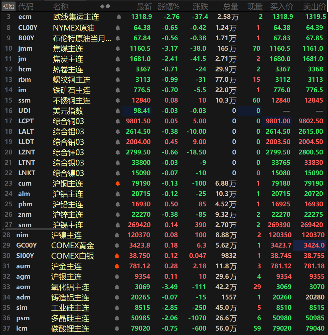 此外,碳酸锂主连跌0.75%,多晶硅主连跌2.06%,工业硅主连跌2.85%。欧线集运主连跌2.76%报1318.9。