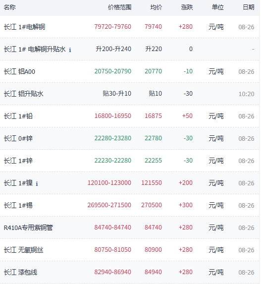 尊敬的用户: 您好! 2025年8月26日SMM 长江1#电解铜价格报价为79540-79760元/吨,R410A专用紫铜管报价为84650-84650元/吨,长江无氧铜丝报价为80660-80960元/吨,长江漆包线报价为82850-86850元/吨和长江磷铜合金报价84950-85450元/吨网站前台显示已做更正,对您造成的不便深感抱歉。