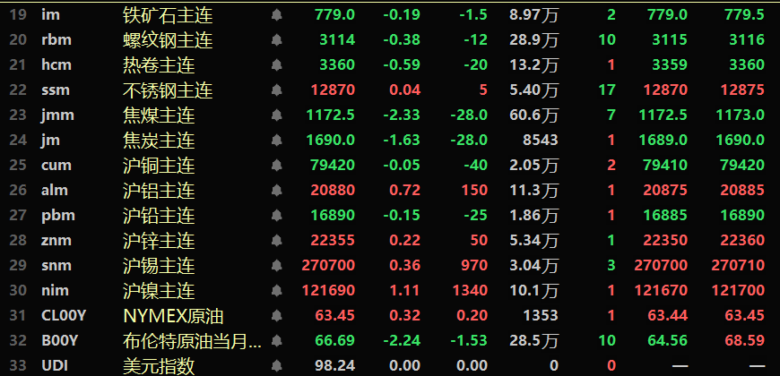 隔夜黑色系多飘绿,铁矿跌0.19%,不锈钢涨0.04%,螺纹钢跌0.38%,热卷跌0.59%。双焦方面:焦煤跌2.33%,焦炭跌1.63%。