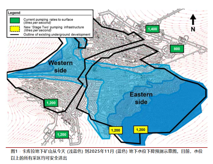 第三阶段抽水作业将于2025年底启动,包括修复卡库拉矿山东区目前处于水位以下的主要泵站以及重新试车工作。第三阶段 (即最后阶段) 抽水作业,将利用现有的卧式抽水设备在东区深部进行全面排水作业。
