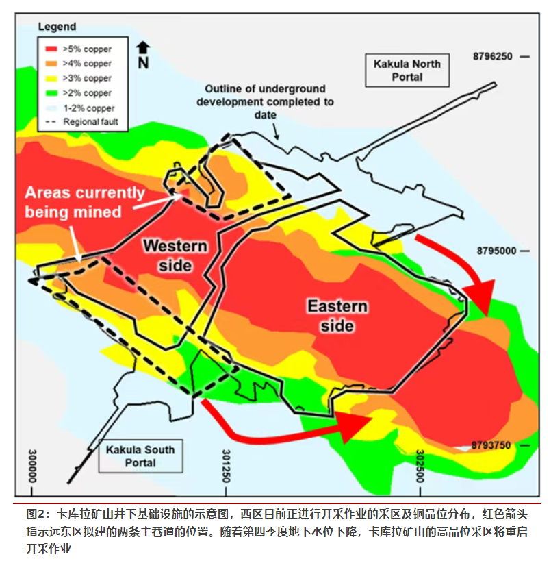 预计卡库拉矿山西区的抽水作业将在8周内完成。卡库拉矿山西区并没有受到矿震的影响,无需进行额外修复工作,预计可较快速地重新打开从矿山西区通往高品位采区 (见图2) 的进场通道。因此,卡库拉矿山的开采品位有望在年底前显著提升。