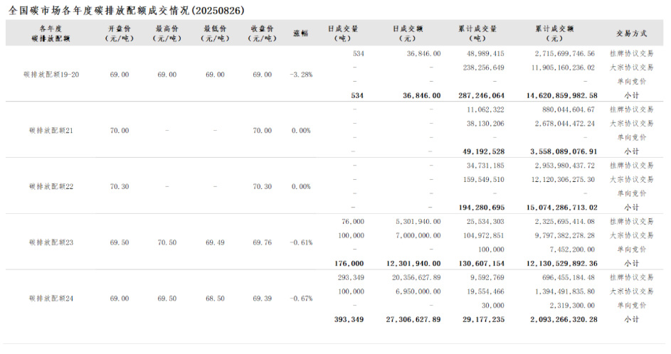 截至2025年8月26日,全国碳市场碳排放配额累计成交量690,503,676吨,累计成交额47,477,031,985.15元。