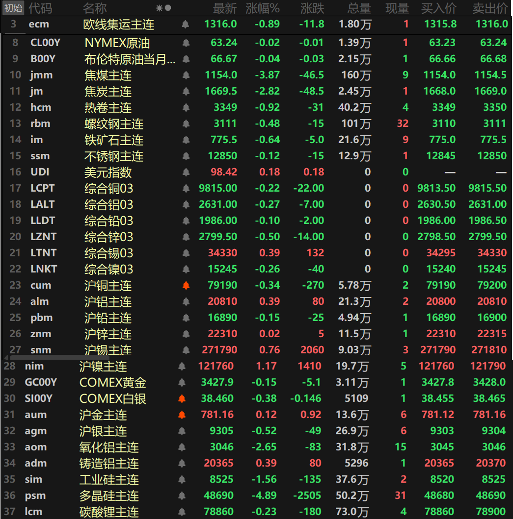 此外,碳酸锂主连跌0.23%,多晶硅主连跌4.89%,录得五连阴。工业硅主连跌1.56%。欧线集运主连跌0.89%报1316。