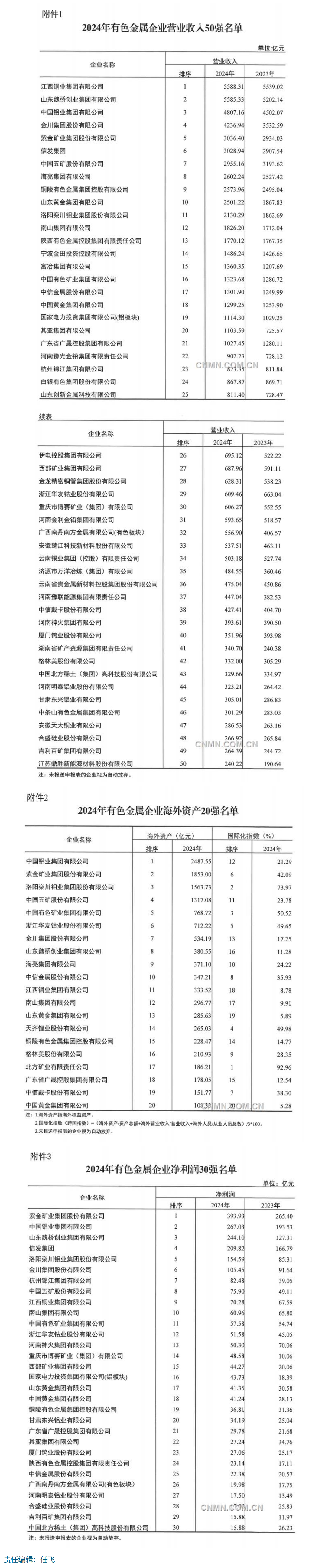 中国有色金属工业协会按照国家有关部门授予的行业统计职能,依照工作惯例,本着严谨、公正、科学的原则,以企业自愿申报为基础,对申报企业2023年填报指标进行了审核,并对申报企业营业收入、净利润、海外资产进行了排序,现将2023年有色金属企业营业收入50强、2023年有色金属企业净利润排序前50名、2023年有色金属企业海外资产20强名单予以发布。