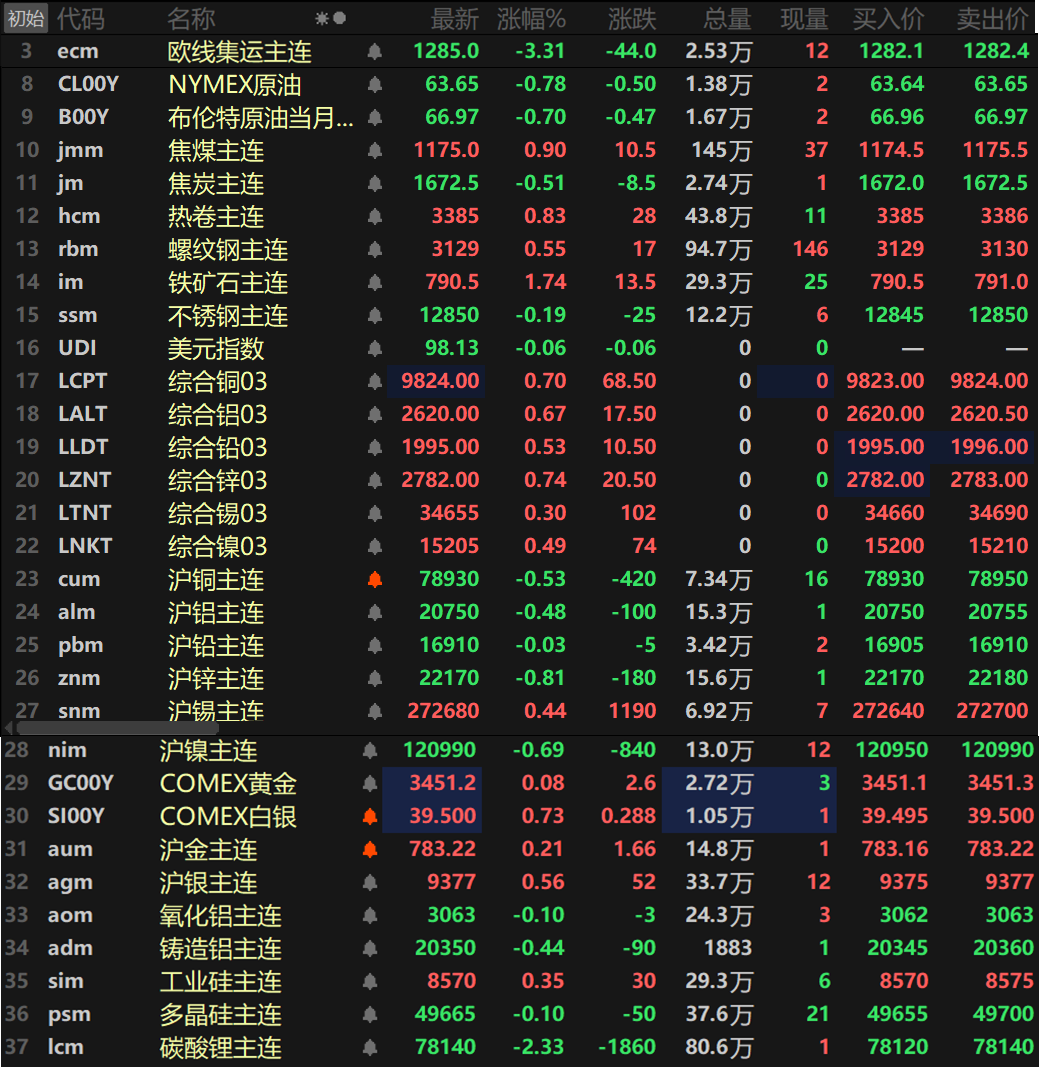 此外,碳酸锂主连跌2.33%,多晶硅主连跌0.1%,工业硅主连涨0.35%,欧线集运主连跌3.31%报1285。