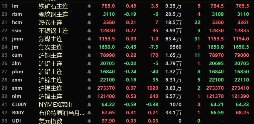隔夜黑色系多飘红,铁矿涨0.45%,不锈钢涨0.27%,螺纹钢跌0.19%,热卷涨0.21%。双焦方面:焦煤涨0.09%,焦炭跌0.45%。