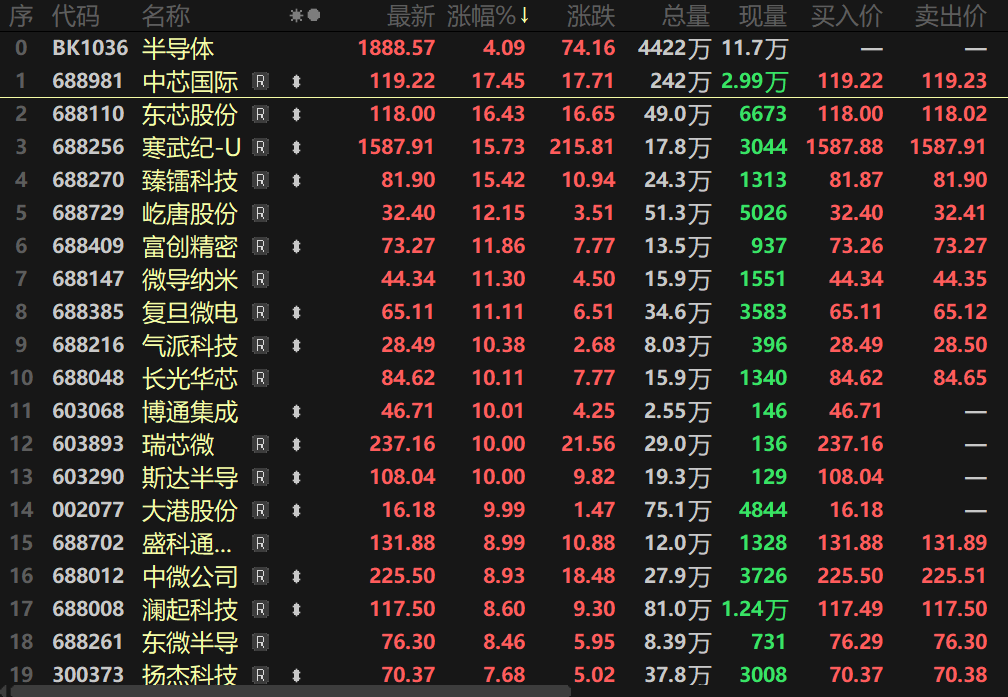 半导体个股方面,中芯国际收盘大涨17.45%,股价最高触及119.22元/股,刷新其股价上市以来的历史新高。公司此前在其2025年二季度业绩说明会上表示,二季度,公司整体实现销售收入22.09亿美元,环比下降1.7%。其中,平均销售单价环比下降6.4%,而销售片数环比增长4.3%至239万片折合八英寸标准逻辑晶圆,主要是因为在国内外政策变化的影响下,渠道加紧备货、补库存,公司也积极配合客户保证出货,这样的情况一直持续到了三季度。