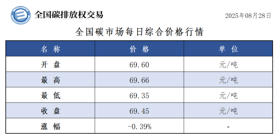 今日全国碳市场综合价格行情为: 开盘价69.60元/吨,最高价69.66元/吨,最低价69.35元/吨,收盘价69.45元/吨,收盘价较前一日下跌0.39%。