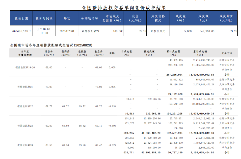截至2025年8月28日,全国碳市场碳排放配额累计成交量694,054,184吨,累计成交额47,715,944,045.97元。