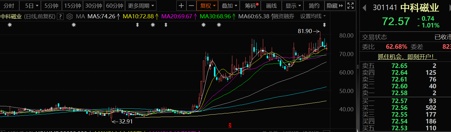 此外,二级市场方面,中科磁业8月28日股价出现下跌,截至28日收盘,中科磁业跌1.01%,报72.57元/股。