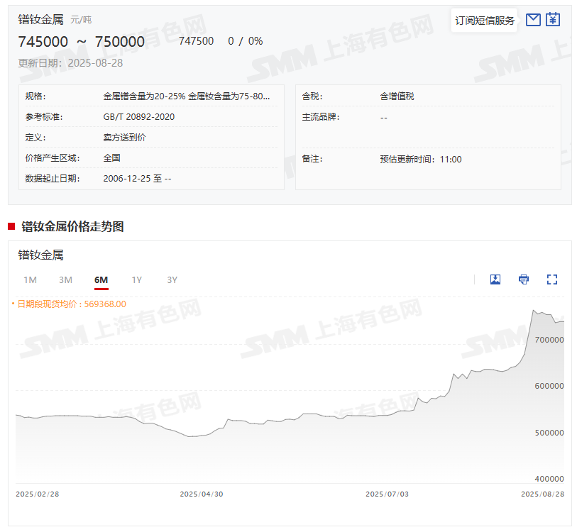 8月28日,镨钕金属价格稳定在74.5-75万元/吨。当前,稀土市场的价格整体保持稳定。在氧化镨钕市场中,随着金属企业低价采购活动的结束,询单量有所下降,实际成交情况也相应减弱。尽管高价成交困难,但生产企业的报价依然坚挺,使得氧化镨钕价格稳定运行。对于镨钕金属市场,头部金属企业的支撑态度促使市场价格继续保持稳定。同时,磁材大厂的采购招标也为镨钕金属价格提供需求支撑。然而,磁材企业的采购意愿一般,导致市场询单较为冷清。总体来看,在下游磁材企业采购意愿较弱的情况下,稀土市场询盘冷清,实际成交量有限,整体价格趋于稳定。预计短期内,受制于现有的市场成交状况,稀土产品的价格将继续保持稳定趋势。