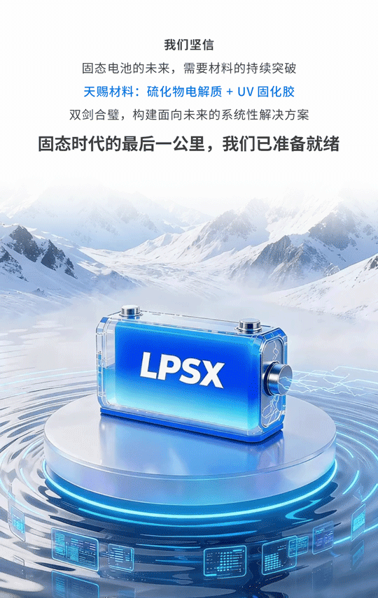 天赐材料通过硫化物电解质+UV固化胶框的系统化解决方案,构建出覆盖电解质核心与封装界面的全链路能力,助力固态电池产业加速从实验室走向量产化。